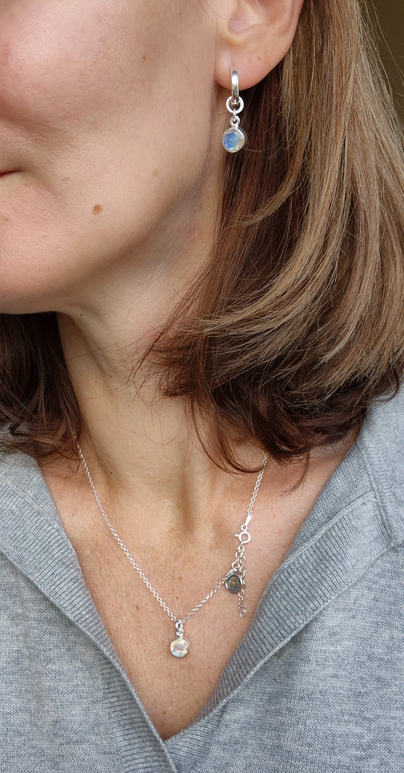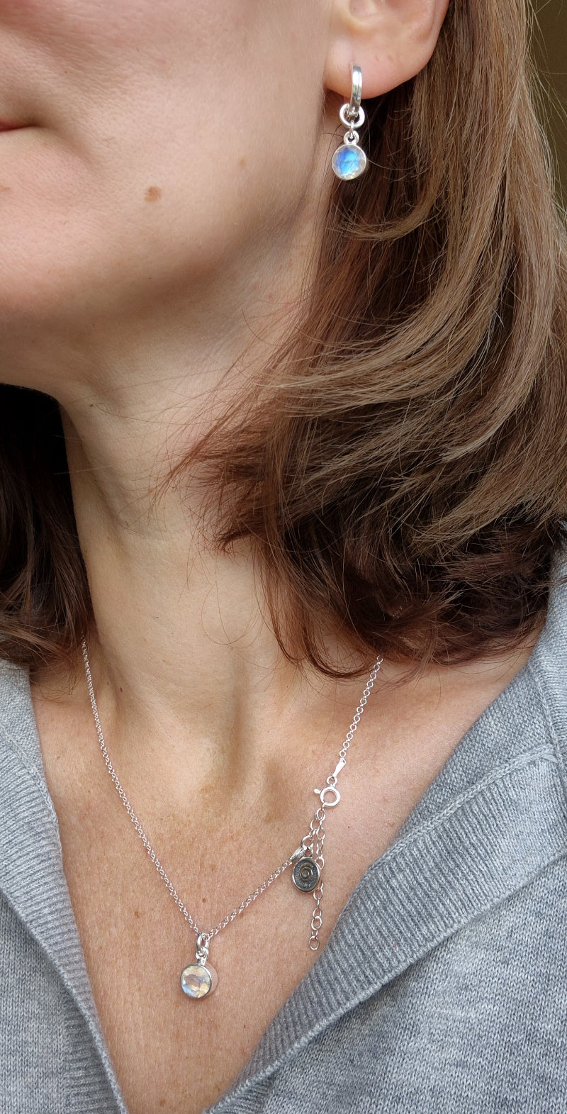 Close-up of a person wearing silver earrings and a necklace with opal stones.