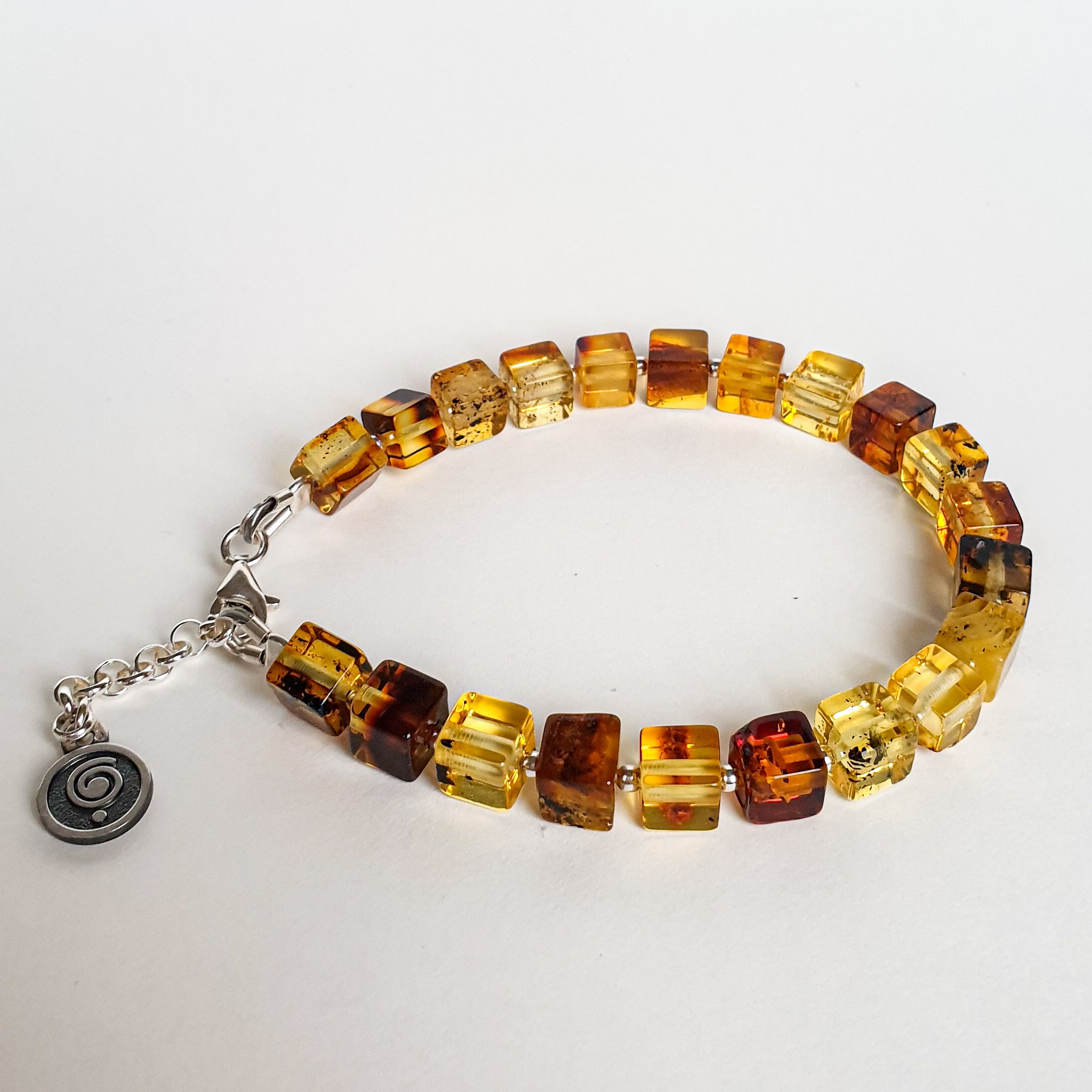 Bracelet for women with natural Baltic Amber and silver 925. It has an accent handcrafted silver 925 medallion with sign of Spiral representing prosperity and growth. Amber diameter is from ~6 mm to 7 mm, amber is polished.