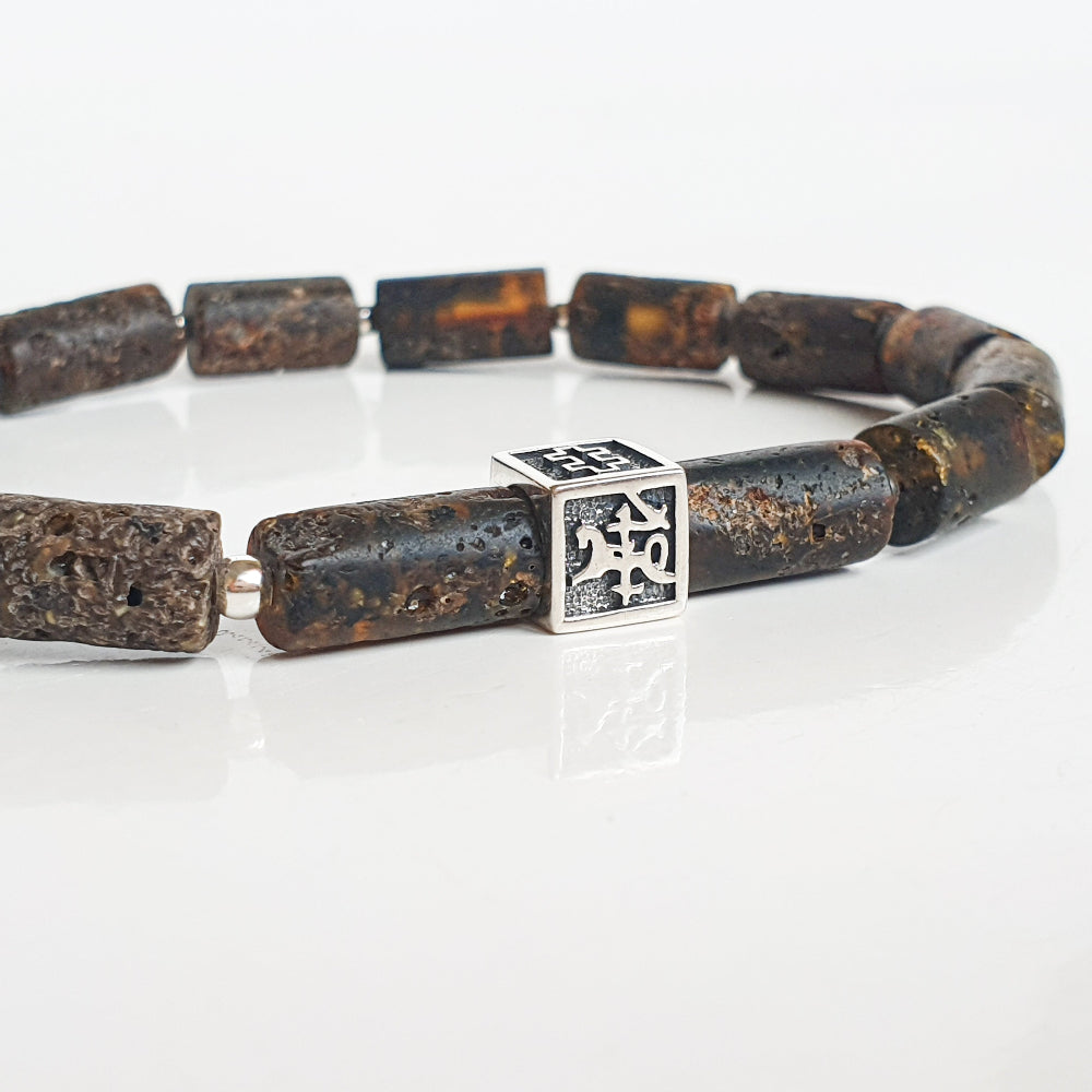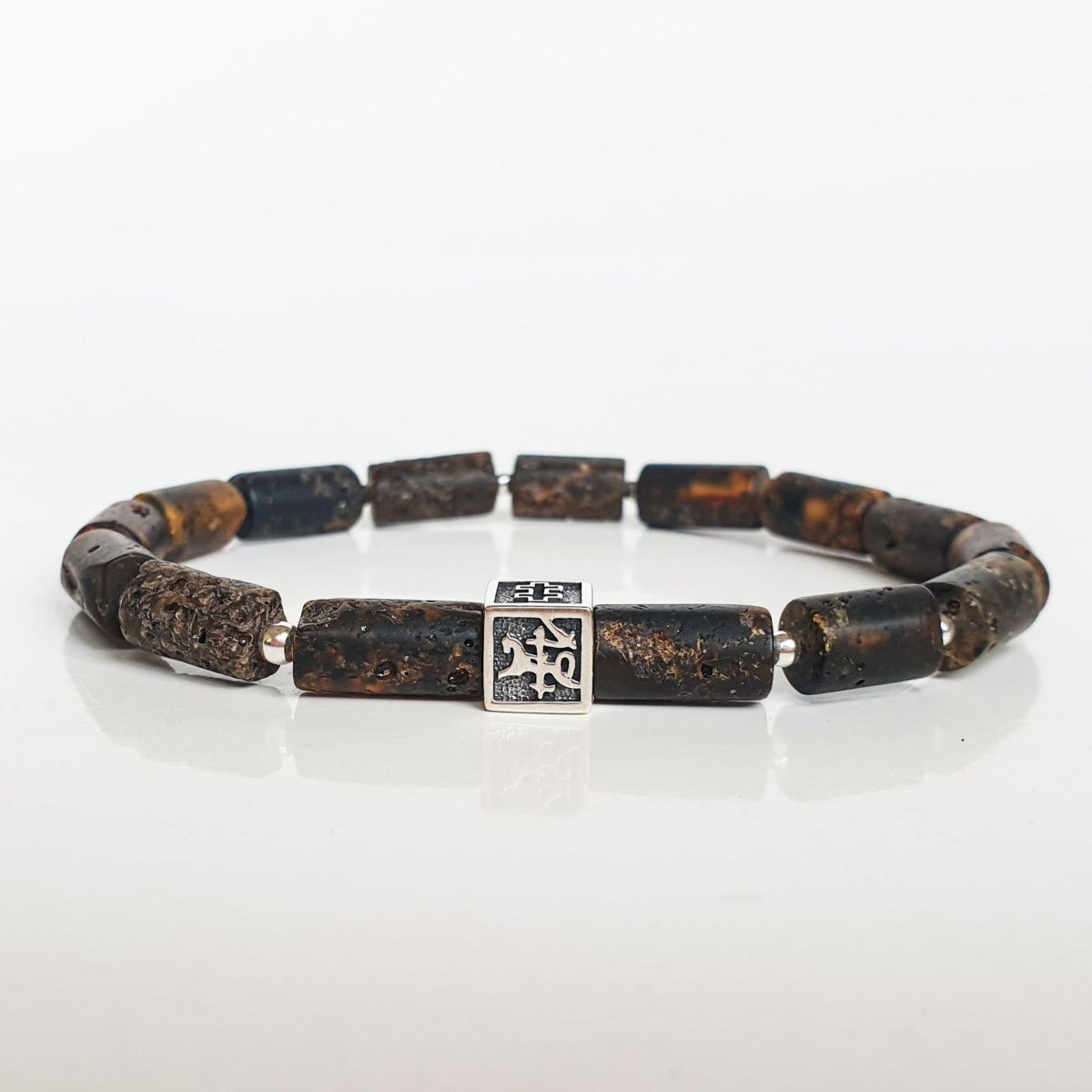 Bracelet with natural Baltic Amber. It has an accent handcrafted charm “Vytis” made of 925 silver (~2,20 g). Amber diameter is 6.5 mm. Total weight of bracelet is 7-10 g.