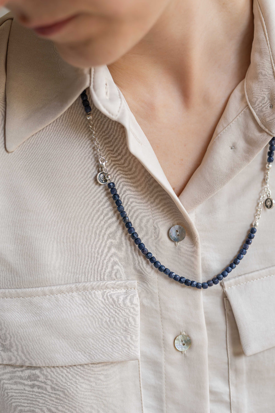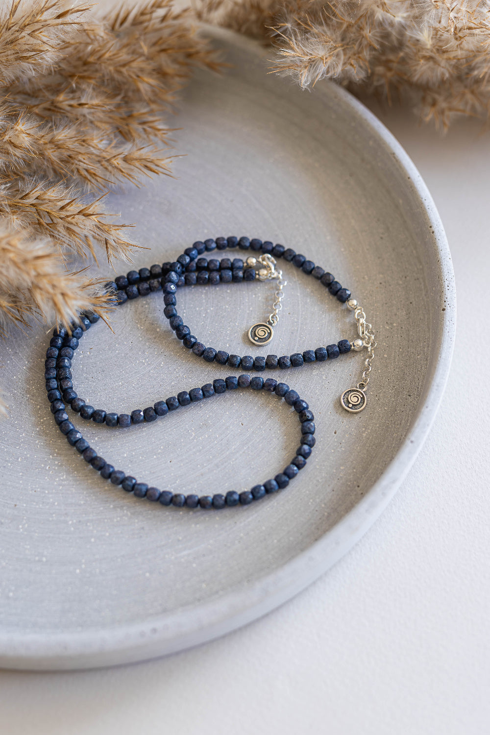 Set of sapphire necklace and bracelet for women. Known as the stone of the Spirit Warrior, the dark blue sapphire awakens its true power in the hands of those walking the path of inner truth. It becomes a loyal guide, revealing the hidden gifts and soul talents we carried with us into this lifetime.