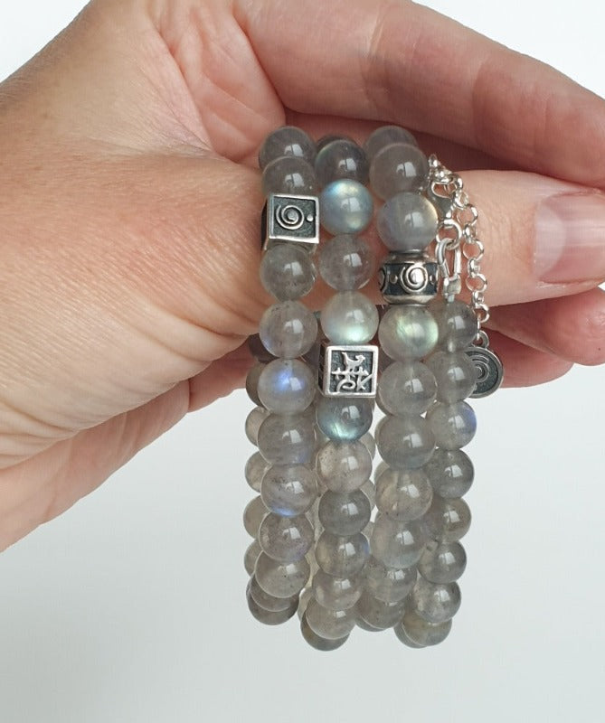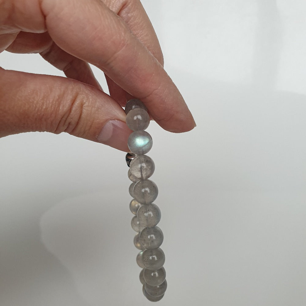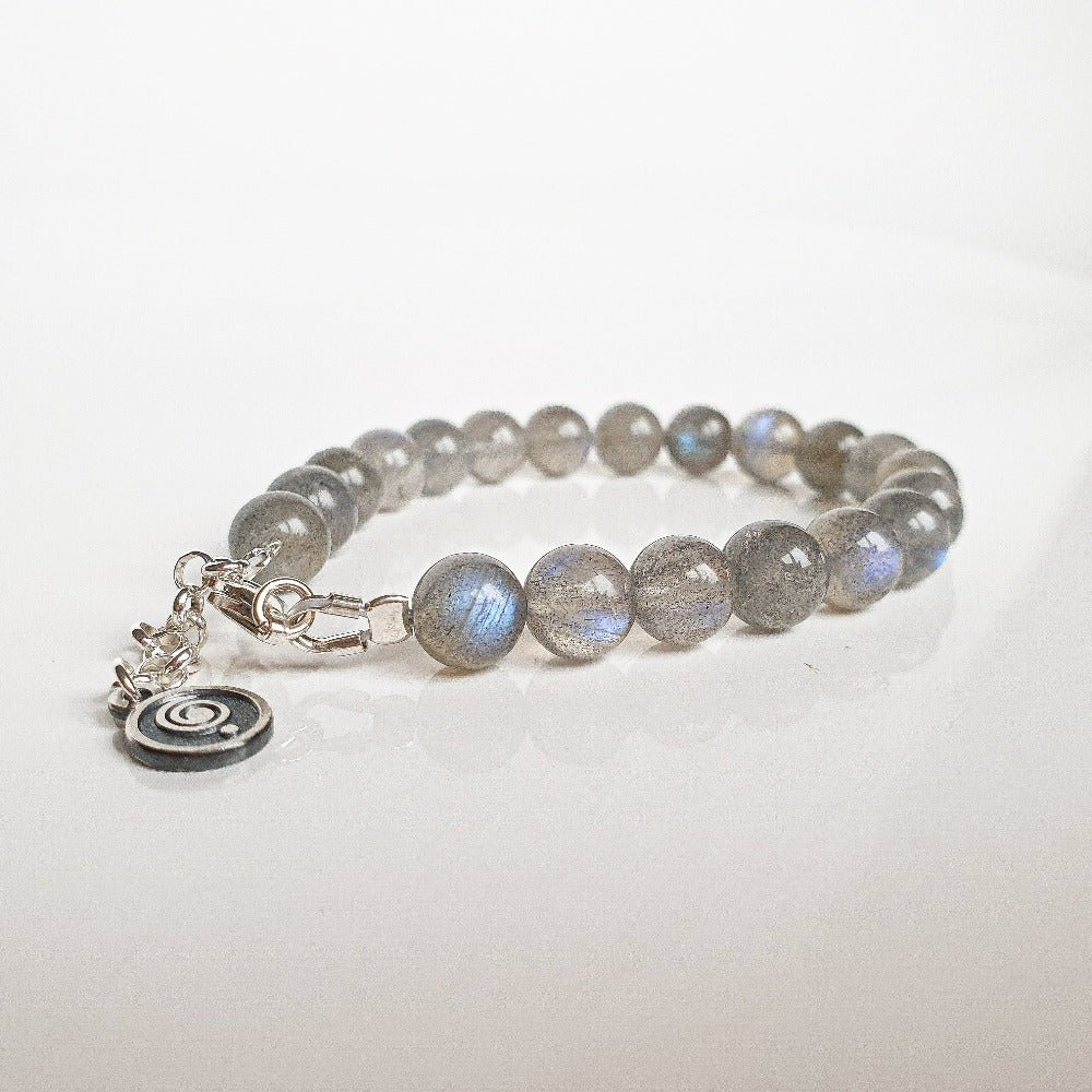 This bracelet for women with natural Labradorite beads protects the wearer, the loved ones, surroundings and home. High-quality Labradorite has an optical rainbow, also known as a “Schiller” effect, which produces a bluish light as the angle of refraction changes.
