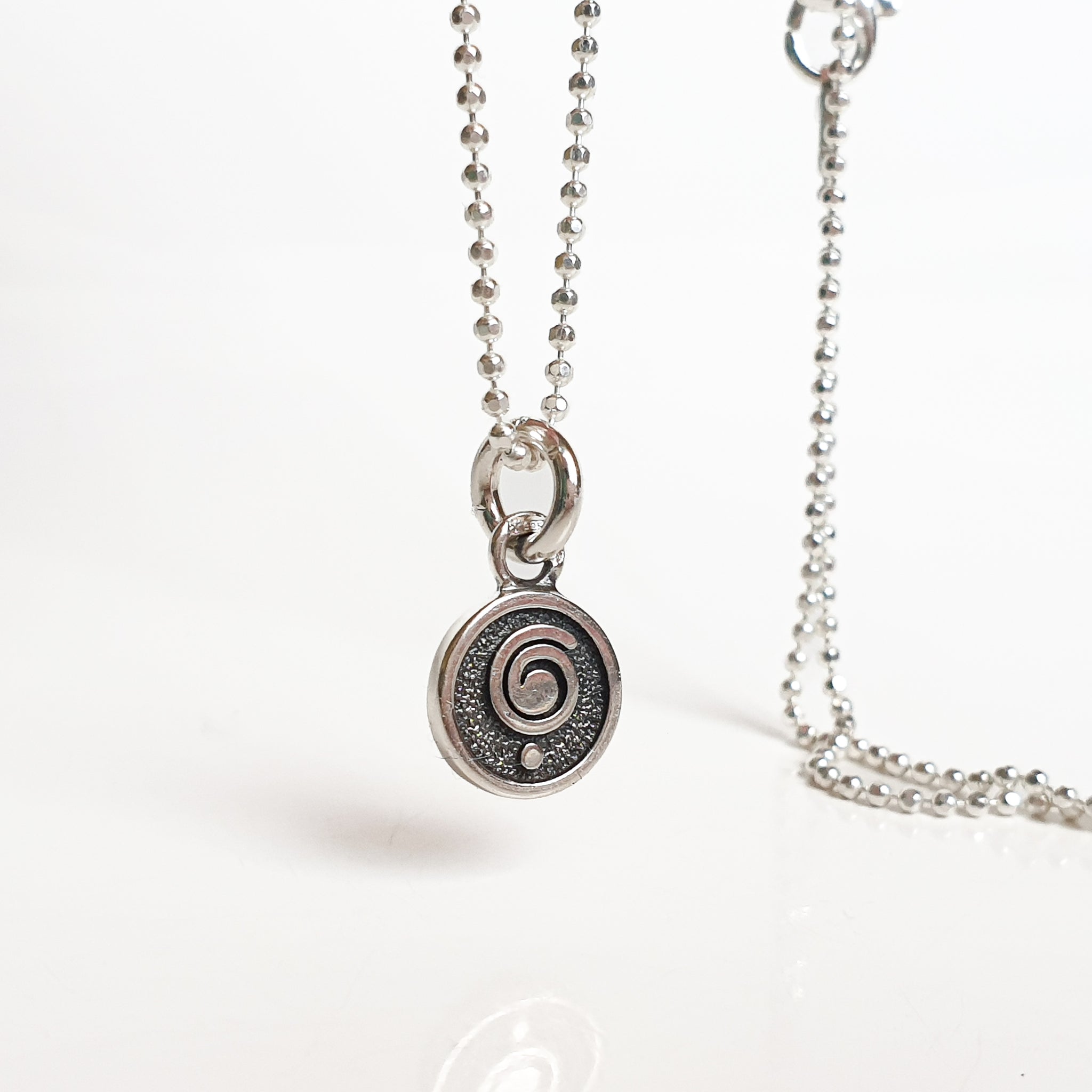 A silver 925 medallion necklace with a spiral design, attached to a silver chain laid out on a white surface.