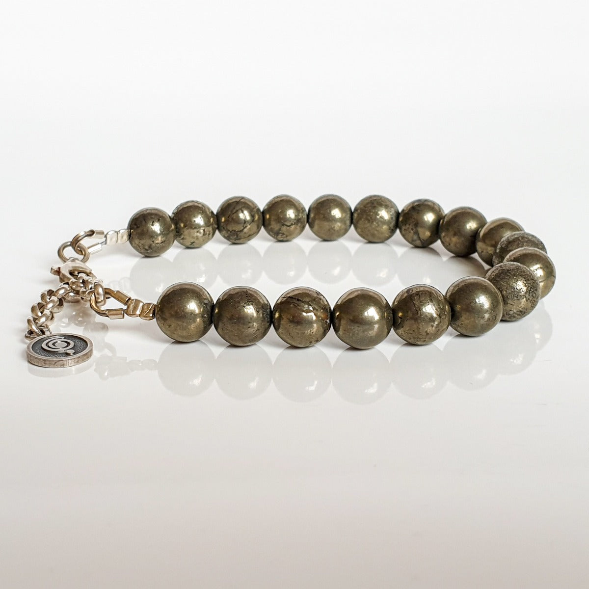 This bracelet for women with 8 mm natural Pyrite beads protects. Pyrite is a good support when someone is concerned, feeling frustrated, having no plans, or even feeling desperate - it raises energy and helps overcome fatigue. It is also a very positive stone. It helps to overcome inertia and gives you self-confidence, frees you from superficiality, reveals your inner abilities and encourages the influx of new ideas.